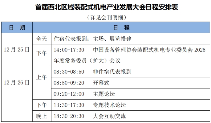 为学习贯彻党的二十届四中全会精神,深入推进“十五五”规划建议的优化区域经济布局,促进区域协调发展目标任务有序落实,协同推动西北区域装配式机电产业体系高质量发展,经中国设备管理协会装配式机电专业委员会研究决定,联合中建三局集团有限公司等单位定于2025年12月下旬在陕西省西安市组织举办“首届西北区域装配式机电产业发展大会(简称:西北装配式机电大会)”。现将有关事项发布通知如下: