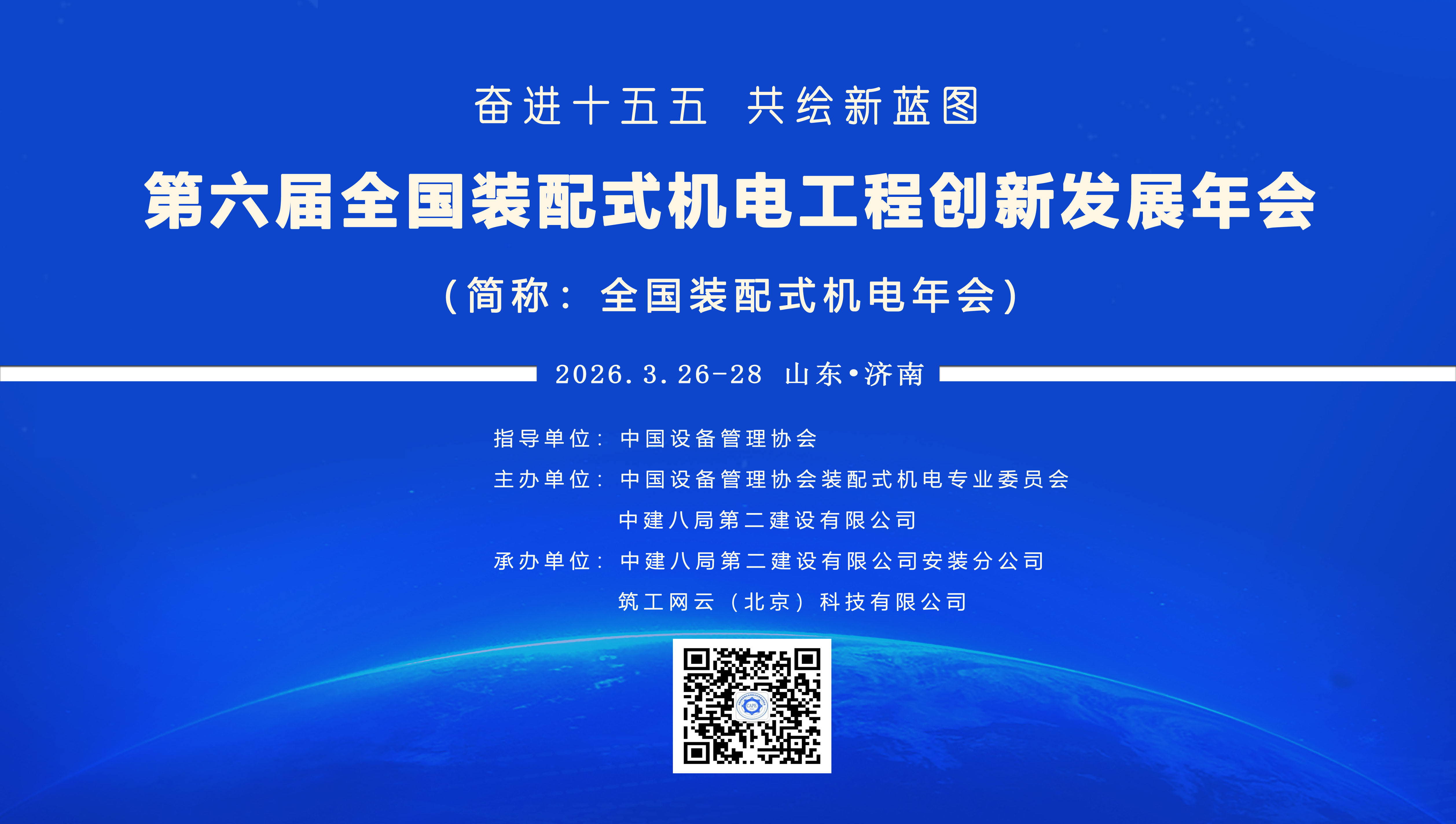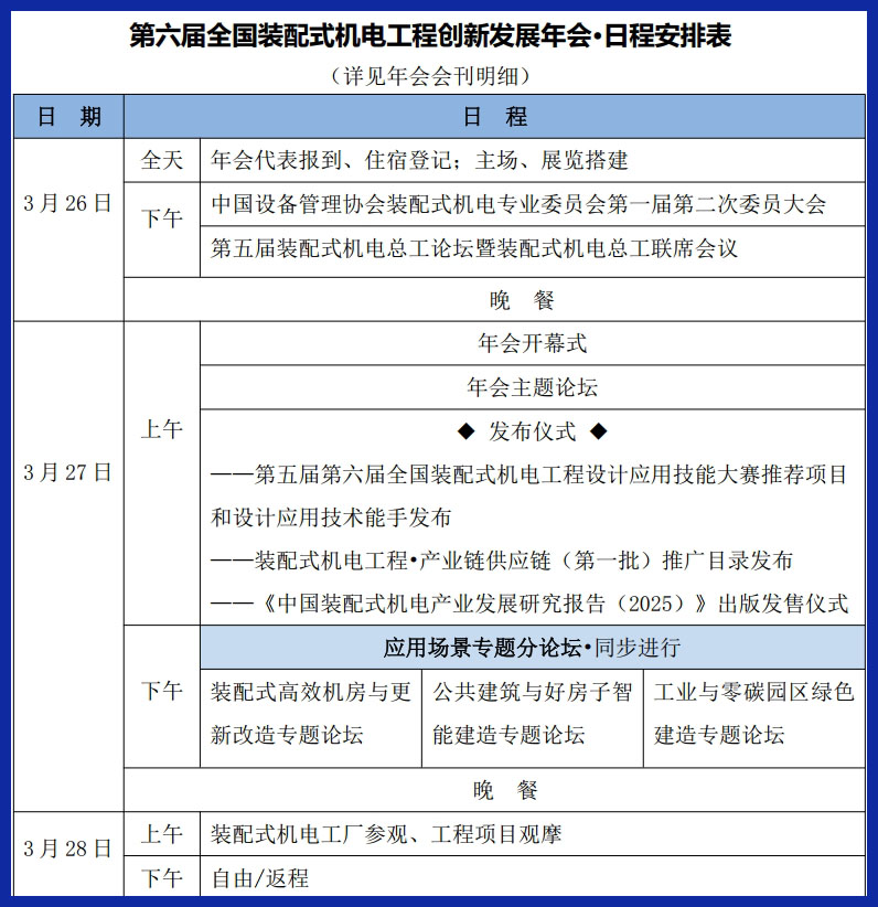 今年是“十五五”规划开局之年,为学习贯彻党的二十届四中全会精神,深入推进“十五五”规划建议确定的主要目标任务有序落实。坚持以经济建设为中心,高质量推进装配式机电现代化产业体系建设开好局、起好步,持续推动工程建造方式变革和创新,建设高品质装配式机电工程。经中国设备管理协会批准,中国设备管理协会装配式机电专业委员会定于2026年3月下旬在山东省济南市组织举办“第六届全国装配式机电工程创新发展年会(简称:全国装配式机电年会)”。本届年会将联合有关企事业单位和行业组织协同举办,继续平行设立主题论坛和专题分论坛、新技术、新产品展览展示等举措,旨在总结“十四五”以来装配式机电所取得的成就,擘画“十五五”发展蓝图。现将有关事项发布第二轮通知如下: